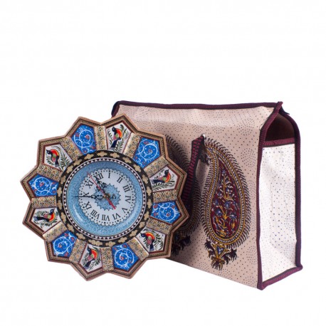 ساعت دیواری شیک-هدیه-----با ساک پارچه ای قلمکار زیپ دار----قطر ساعت چوبی 32 سانتی متر