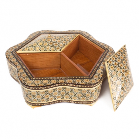 شکلات خوری بزرگ خاتم کاری با سه محفظه مجزا و سه درب دسته برنجی لوزی شکل برای پذیرایی گز و شیرینی و اجیل و ....